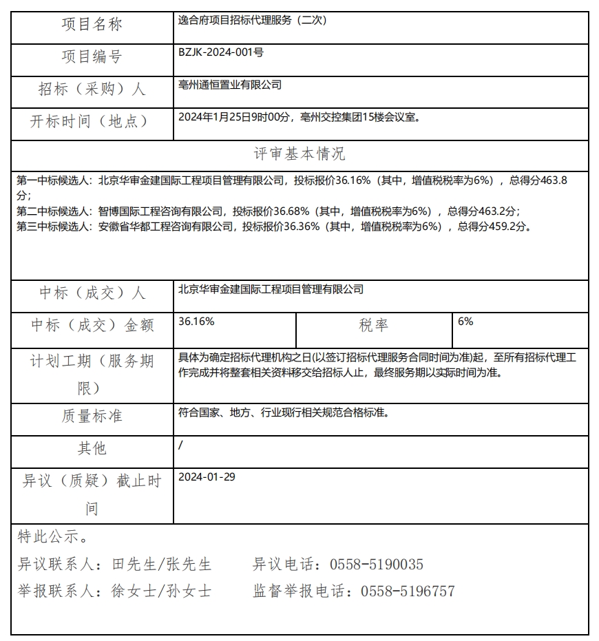 逸合府項目招標(biāo)代理服務(wù)(二次)中標(biāo)(成交)結(jié)果公示
