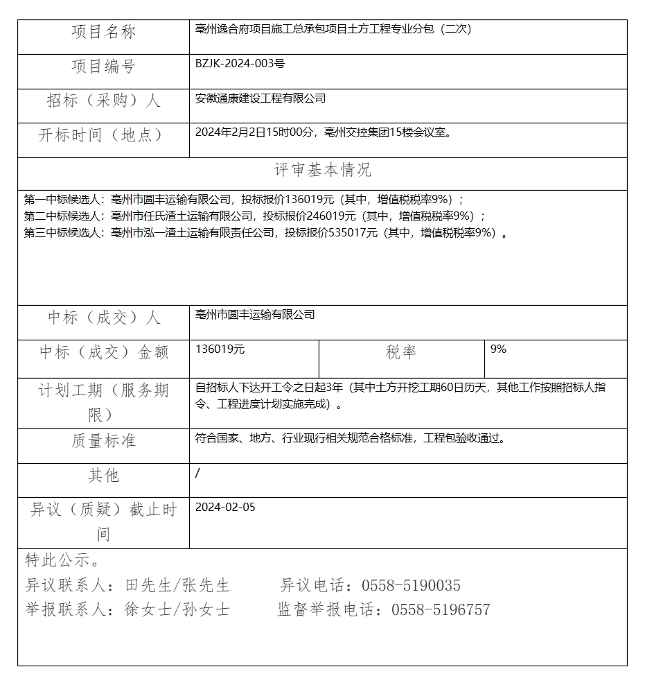 亳州逸合府項(xiàng)目施工總承包項(xiàng)目土方工程專業(yè)分包(二次)中標(biāo)(成交)結(jié)果公示