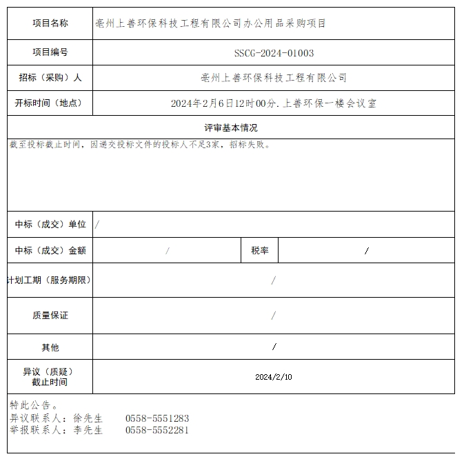 亳州上善環(huán)保科技工程有限公司辦公用品采購項目中標結果公示