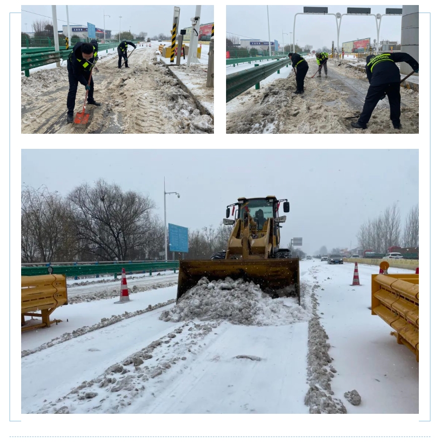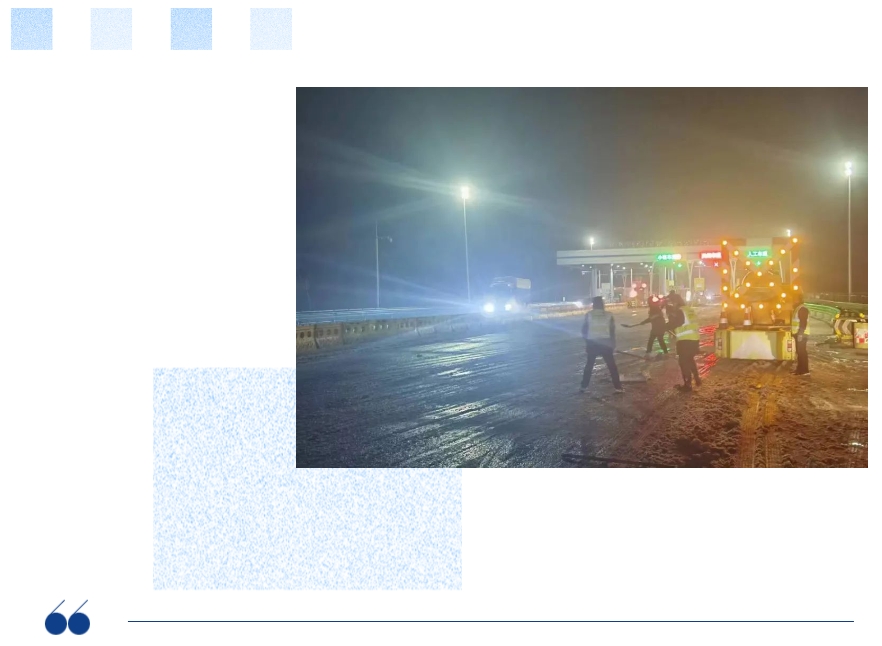通達利公司全員值班值守,制定掃雪除冰布置方案,全線共計安排7個作業(yè)點,每個作業(yè)點布置1臺鏟車、1個隊伍,確保急彎陡坡、重要橋梁等位置應急保通;成立應急保障小隊,積極組織人員對道路進行破冰除障,確保車輛進出安全。同時,對道路標志、路燈等設施進行檢修維護,切實提高夜間行車可見性和安全性。共計出動養(yǎng)護作業(yè)車6輛,融雪劑撒布機2臺,鏟車7臺,工作人員35人,撒布融雪劑近20噸。
