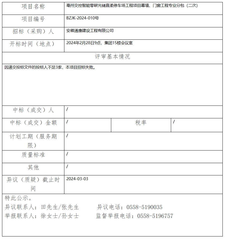 亳州交控智能零碳光儲(chǔ)直柔停車場工程項(xiàng)目幕墻、門窗工程專業(yè)分包(二次)中標(biāo)(成交)結(jié)果公示