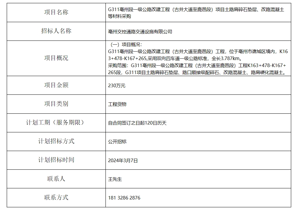 G311亳州段一級(jí)公路改建工程(古井大道至鹿邑段)項(xiàng)目土路肩碎石墊層、改路混凝土等材料采購(gòu)招標(biāo)計(jì)劃