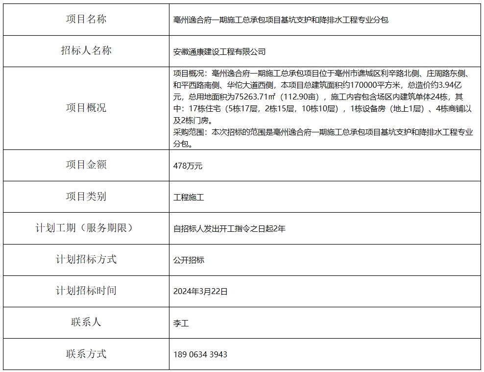 亳州逸合府一期施工總承包項目基坑支護和降排水工程專業(yè)分包招標計劃