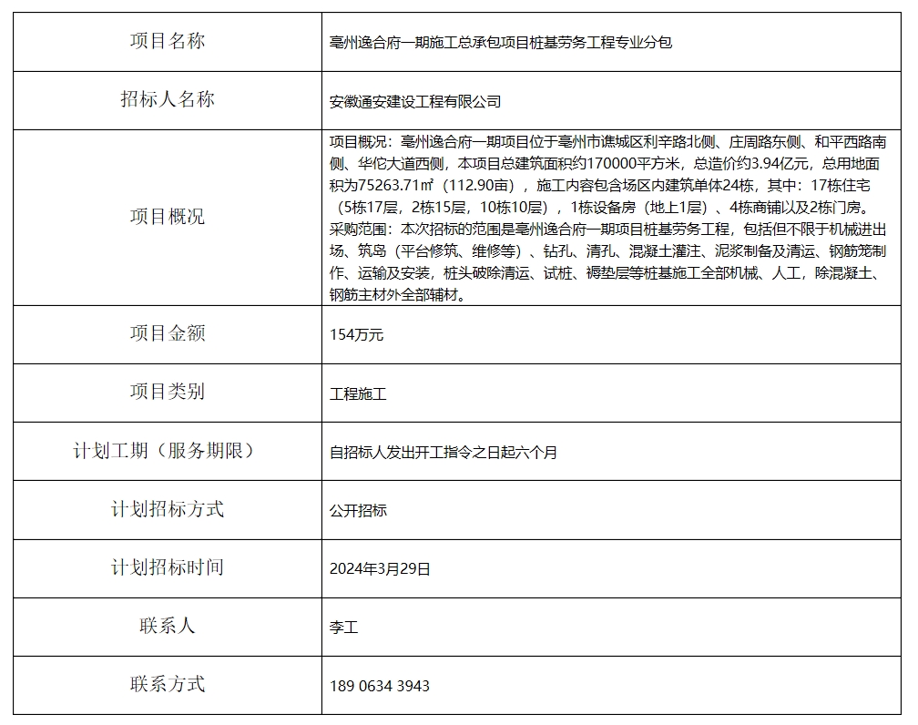 亳州逸合府一期施工總承包項目樁基勞務(wù)工程專業(yè)分包招標(biāo)計劃