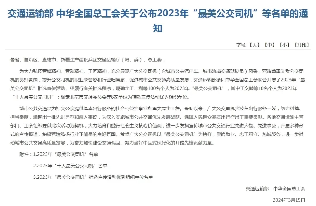 近日,交通運(yùn)輸部、中華全國(guó)總工會(huì)聯(lián)合發(fā)布2023年“最美公交司機(jī)”等名單,亳州公交駕駛員高團(tuán)結(jié)獲評(píng)“最美公交司機(jī)”。