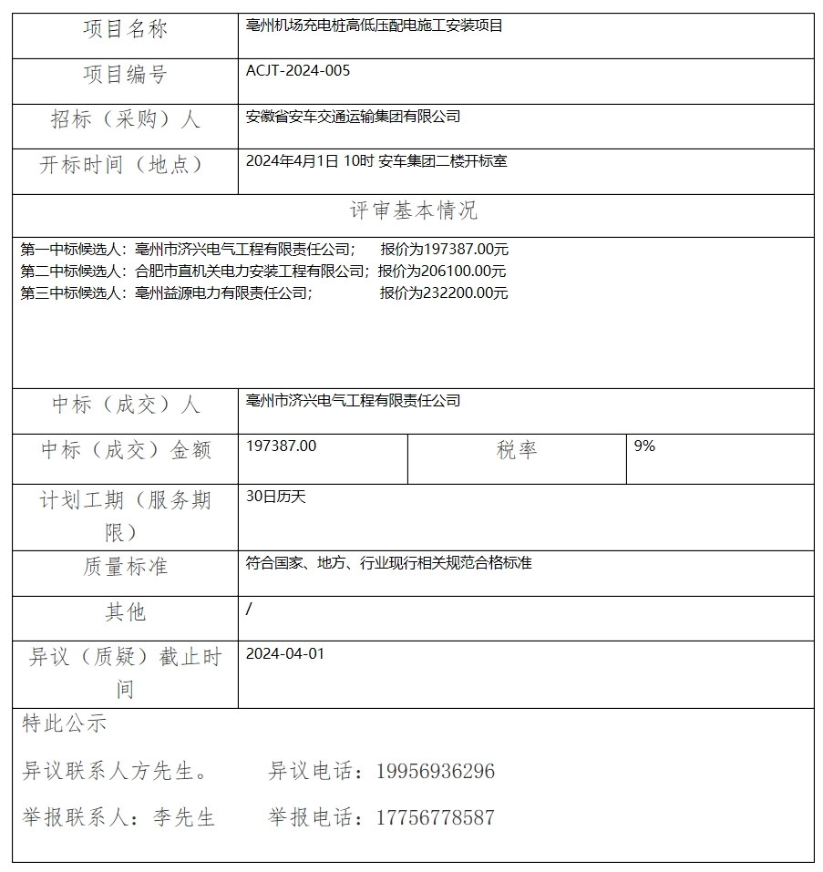 亳州機(jī)場充電樁高低壓配電施工安裝項(xiàng)目中標(biāo)(成交)結(jié)果公示