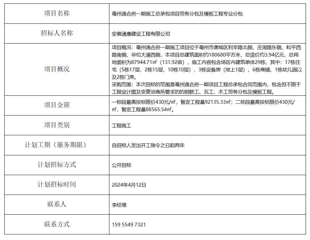 亳州逸合府一期施工總承包項目勞務分包及模板工程專業(yè)分包招標計劃