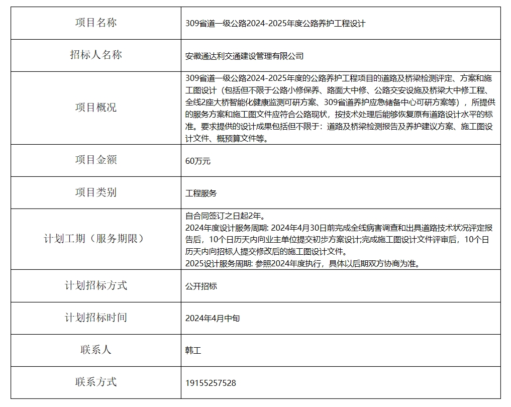 309省道一級公路2024-2025年度公路養(yǎng)護(hù)工程設(shè)計招標(biāo)計劃