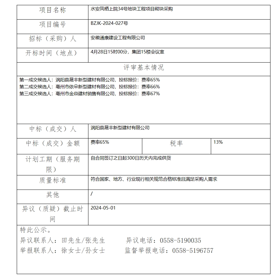 水安鳳棲上院34號地塊工程項目砌塊采購中標(成交)結(jié)果公示