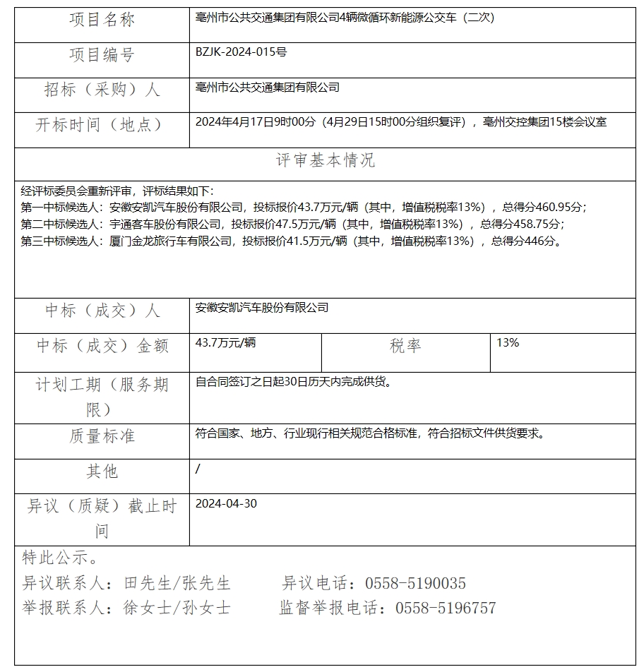 亳州市公共交通集團(tuán)有限公司4輛微循環(huán)新能源公交車(二次)中標(biāo)結(jié)果變更公示