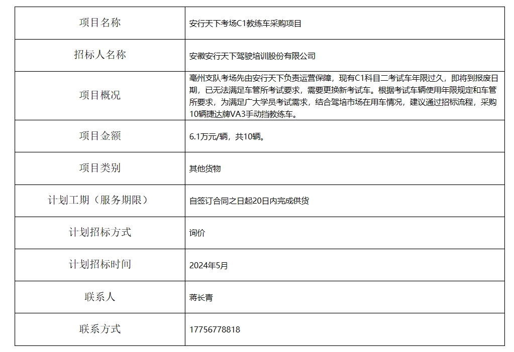 安行天下考場C1教練車采購項(xiàng)目招標(biāo)計(jì)劃