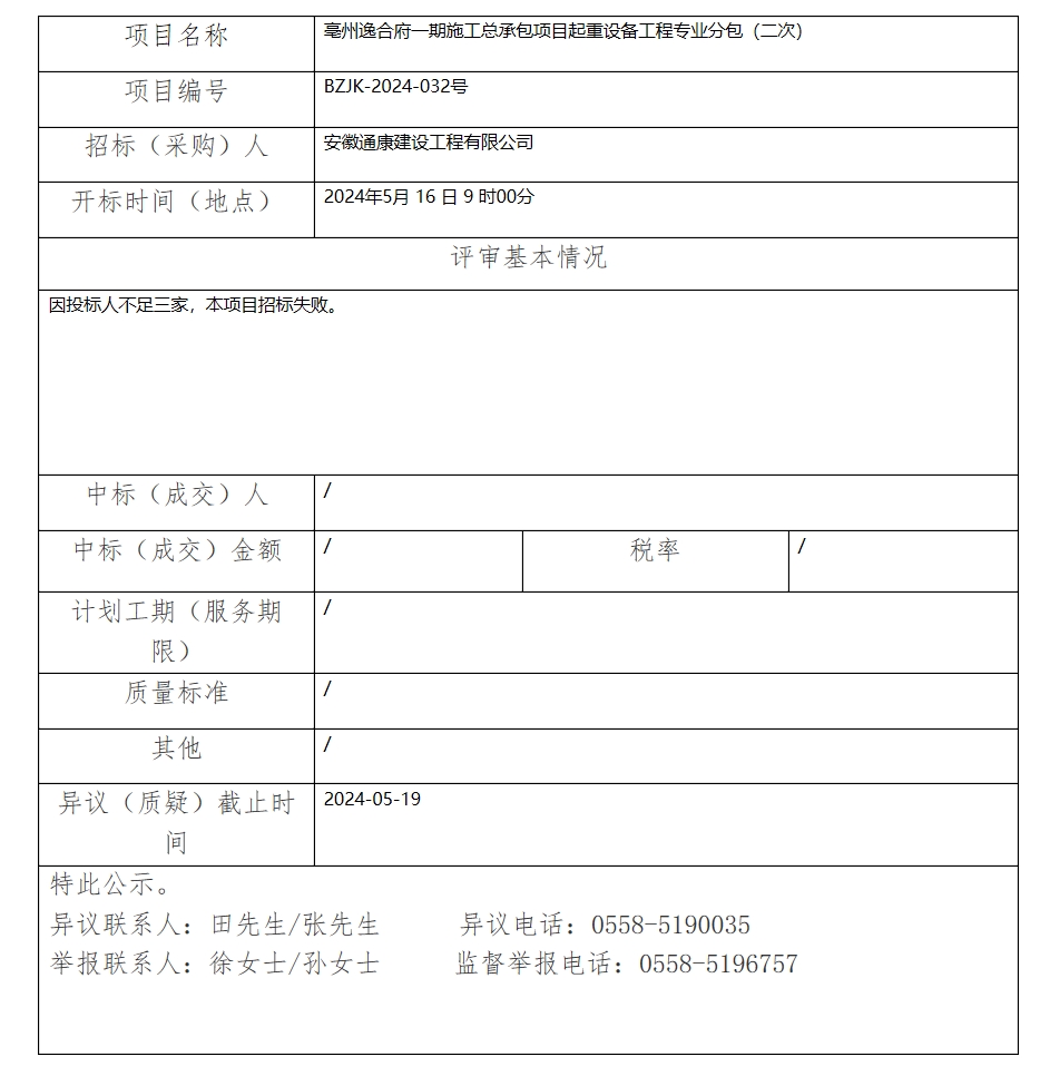 亳州逸合府一期施工總承包項目起重設(shè)備工程專業(yè)分包(二次)中標(成交)結(jié)果公示