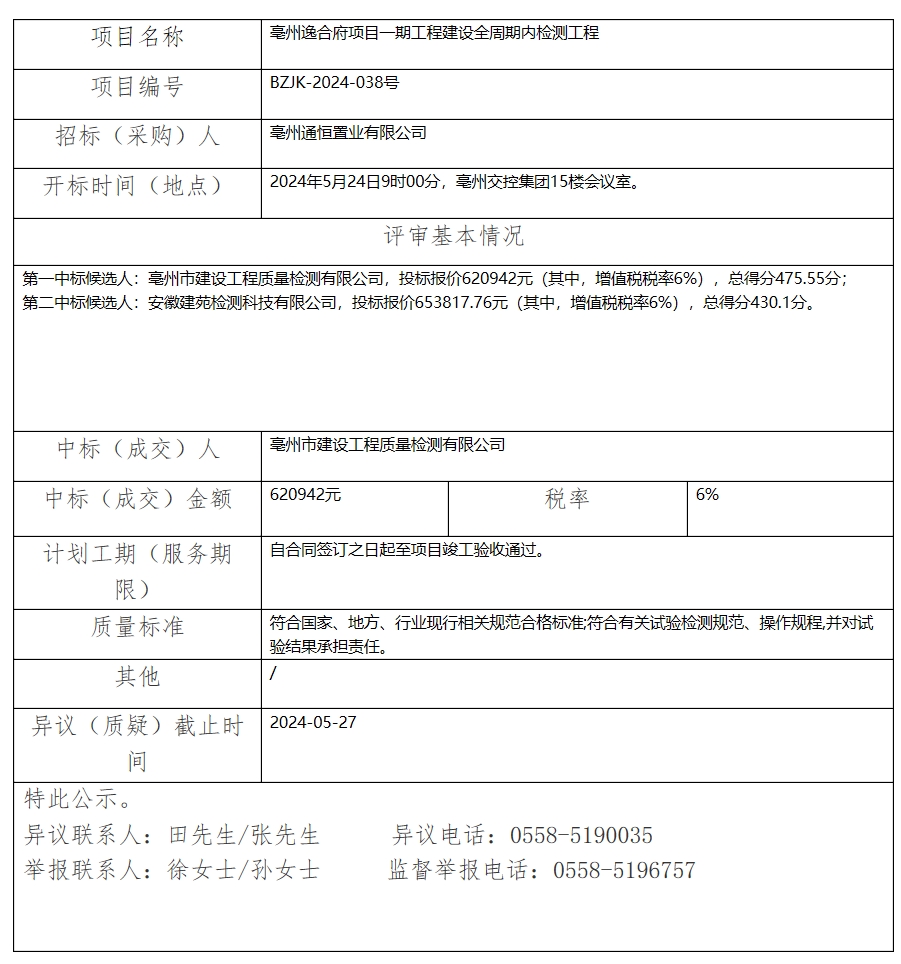 亳州逸合府項目一期工程建設(shè)全周期內(nèi)檢測工程中標(biāo)(成交)結(jié)果公示