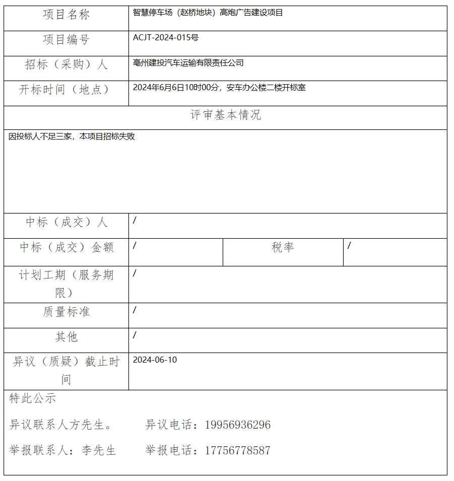 智慧停車場(趙橋地塊)高炮廣告建設項目中標(成交)結果公示