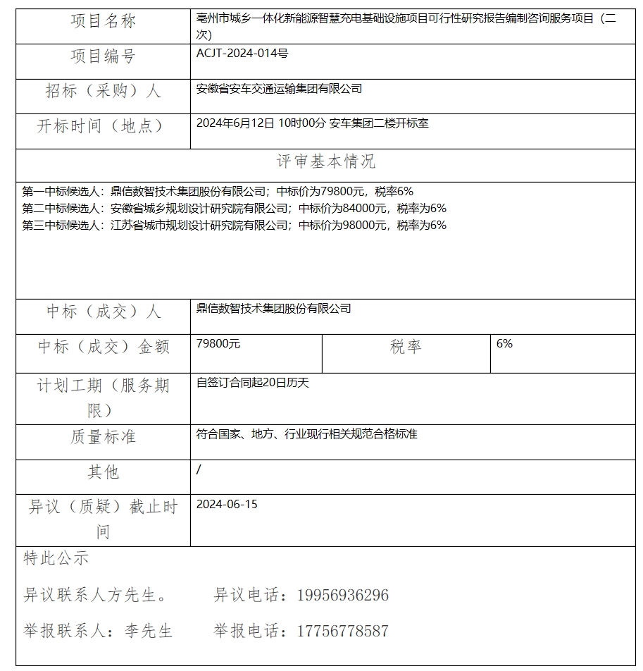 亳州市城鄉(xiāng)一體化新能源智慧充電基礎設施項目可行性研究報告編制咨詢服務項目(二次)中標(成交)結果公示