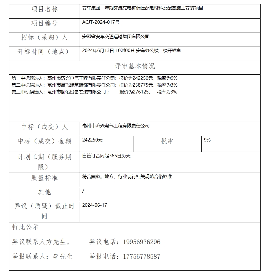 安車集團(tuán)一年期交流充電樁低壓配電材料及配套施工安裝項(xiàng)目中標(biāo)(成交)結(jié)果公示