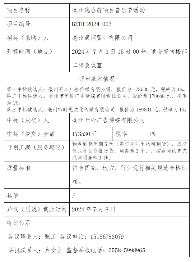 亳州逸合府項目開盤活動中標(biāo)結(jié)果公示