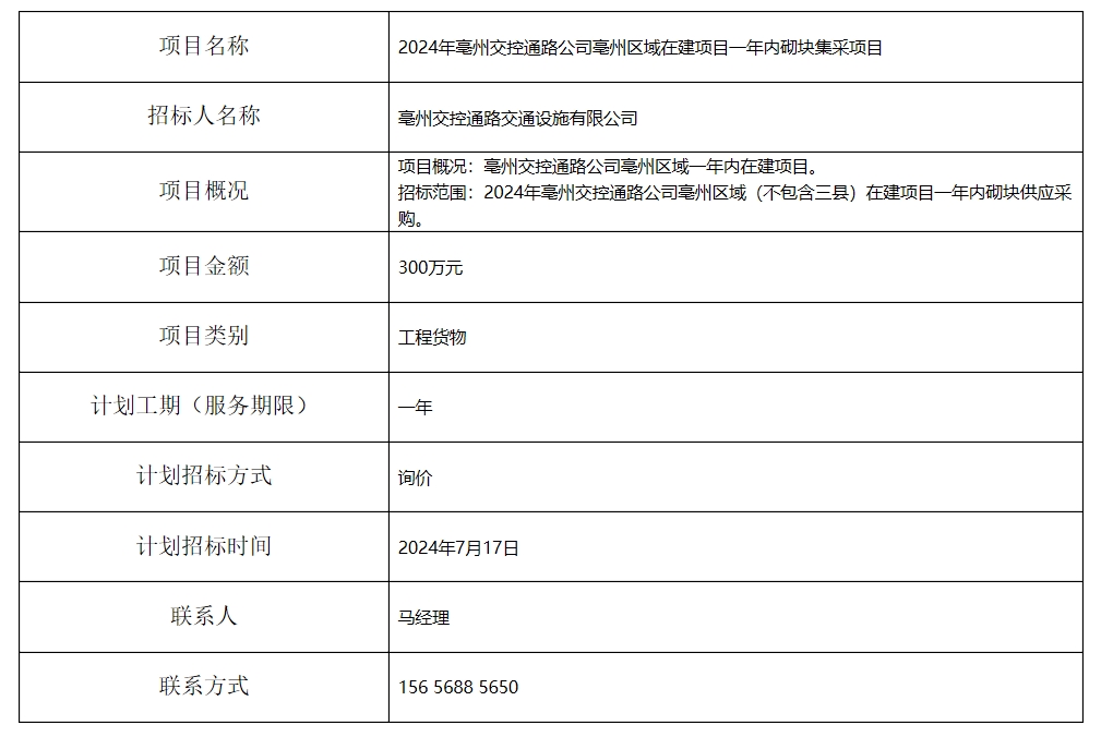 2024年亳州交控通路公司亳州區(qū)域在建項(xiàng)目一年內(nèi)砌塊集采項(xiàng)目招標(biāo)計(jì)劃