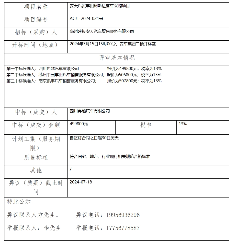 安天汽貿(mào)豐田柯斯達客車采購項目中標(成交)結(jié)果公示