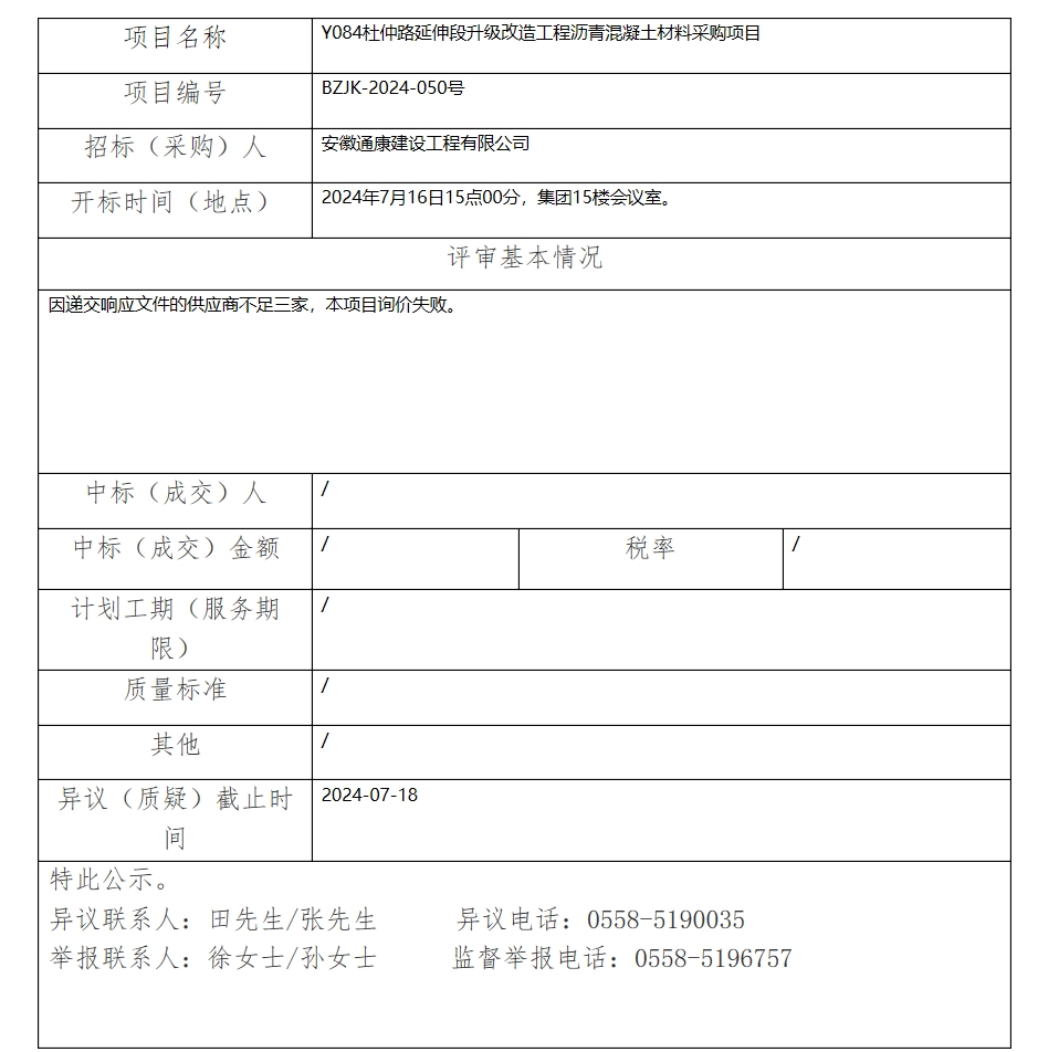 Y084杜仲路延伸段升級改造工程瀝青混凝土材料采購項目中標(biāo)(成交)結(jié)果公示