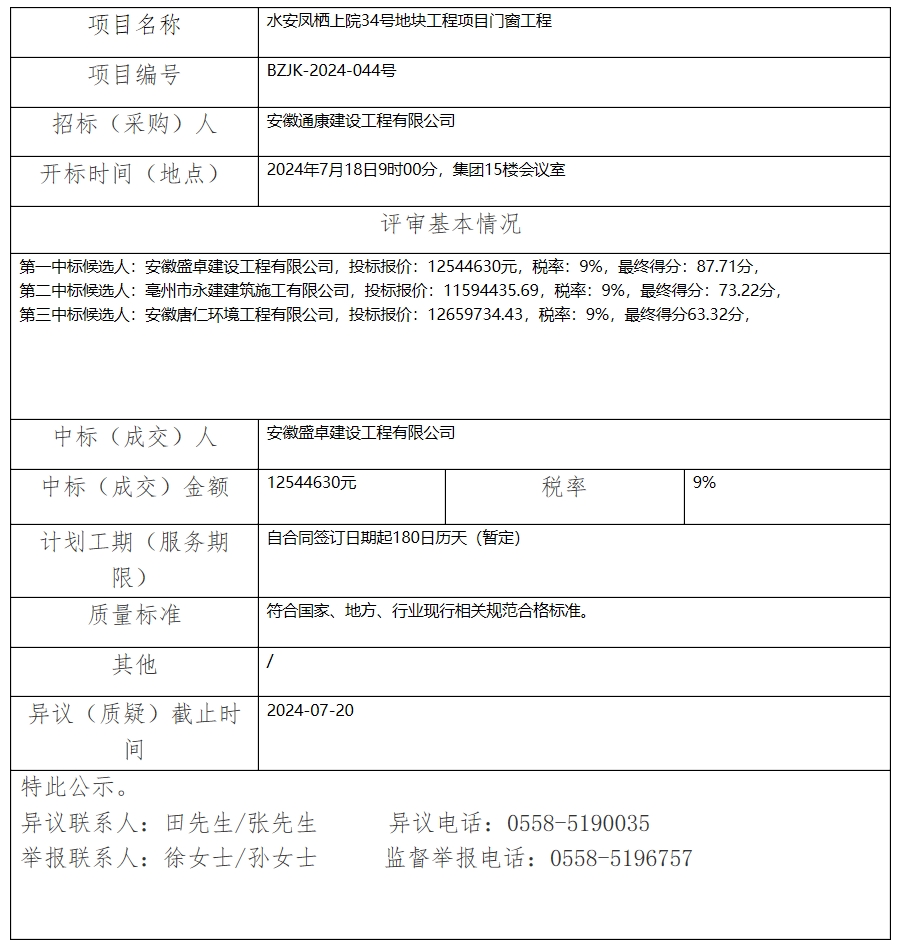 水安鳳棲上院34號地塊工程項目門窗工程中標(成交)結果公示