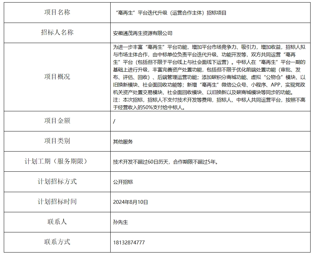 “亳再生”平臺迭代升級(運營合作主體)項目招標計劃