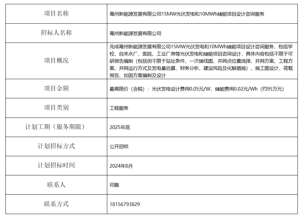 亳州新能源發(fā)展有限公司15MW光伏發(fā)電和10MWh儲(chǔ)能項(xiàng)目設(shè)計(jì)咨詢(xún)服務(wù)招標(biāo)計(jì)劃