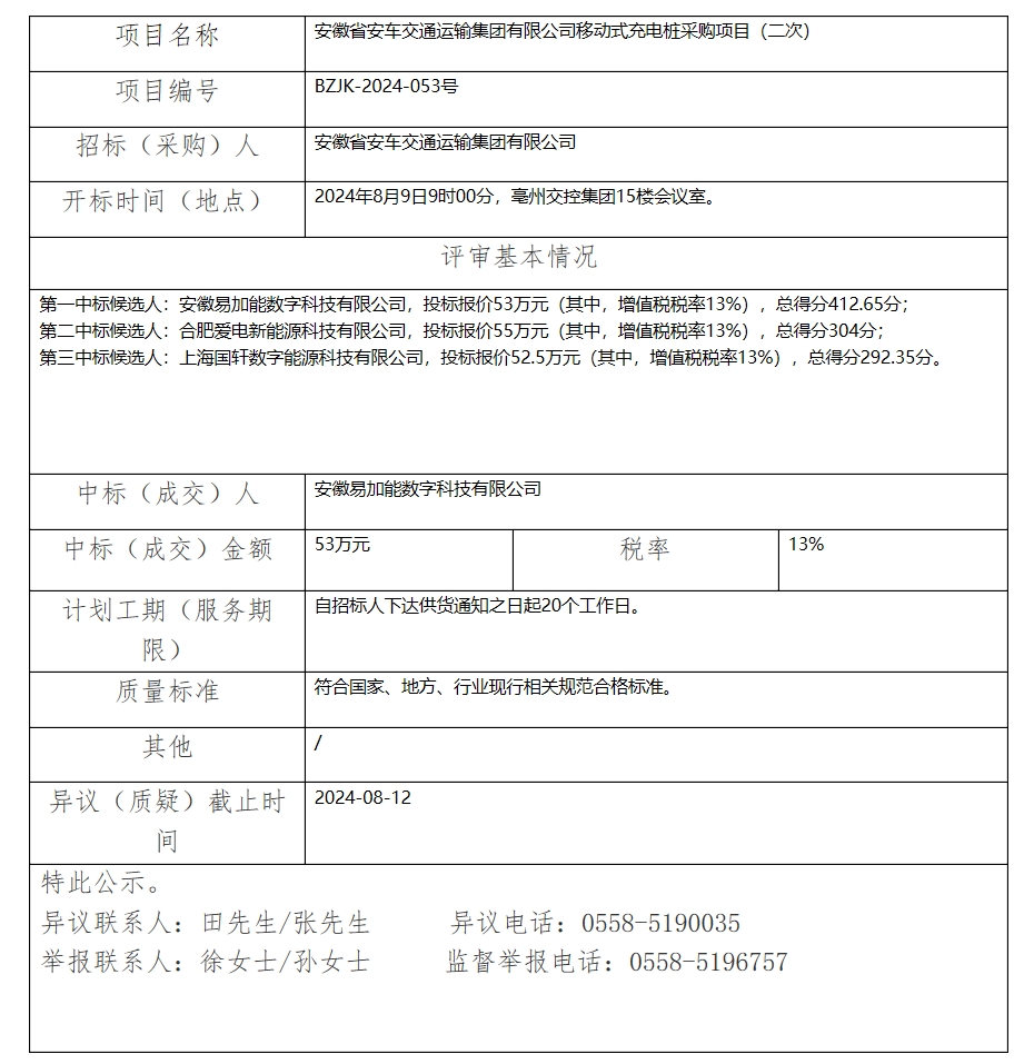 安徽省安車交通運輸集團有限公司移動式充電樁采購項目(二次)中標(成交)結(jié)果公示