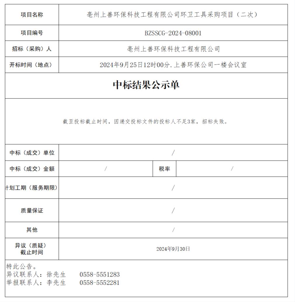 亳州上善環(huán)保科技工程有限公司環(huán)衛(wèi)工具采購項(xiàng)目中標(biāo)結(jié)果公示