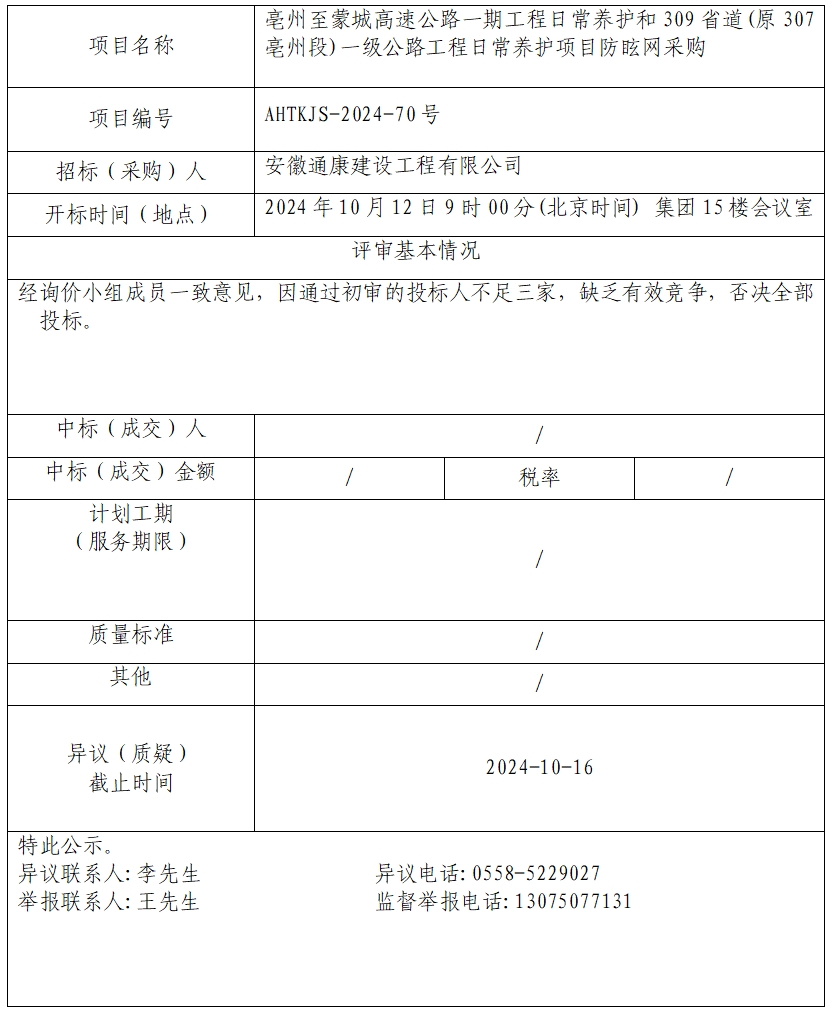 亳州至蒙城高速公路一期工程日常養(yǎng)護(hù)和309省道(原307亳州段)一級公路工程日常養(yǎng)護(hù)項目防眩網(wǎng)采購項目中標(biāo)(成交)結(jié)果公示