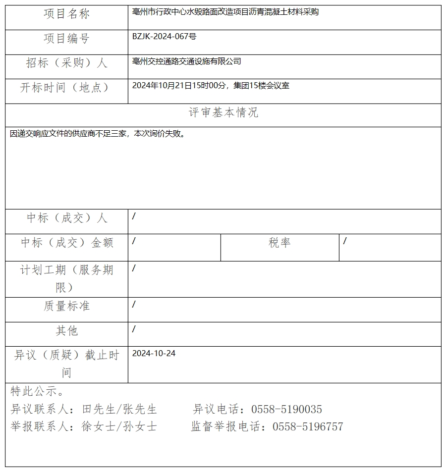 亳州市行政中心水毀路面改造項(xiàng)目瀝青混凝土材料采購(gòu)中標(biāo)(成交)結(jié)果公示