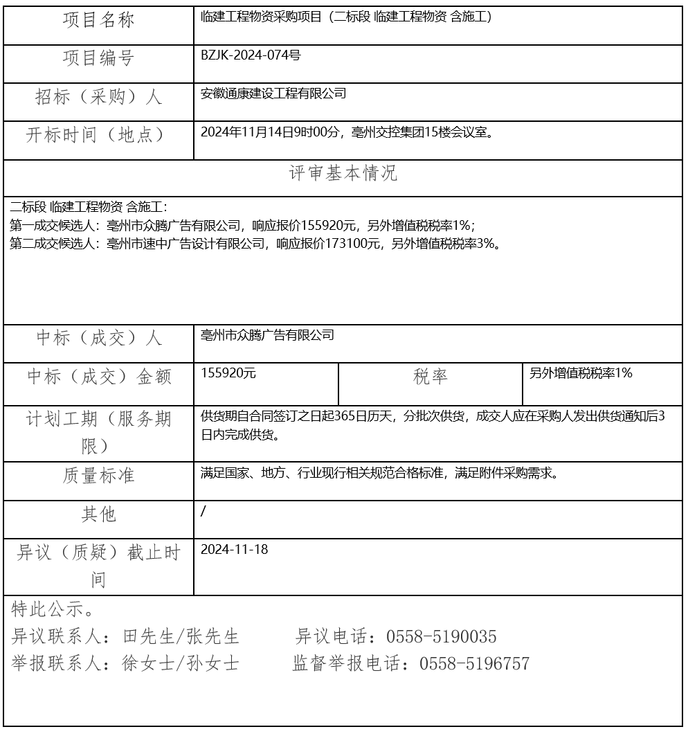 臨建工程物資采購項目(二標(biāo)段 臨建工程物資 含施工)中標(biāo)(成交)結(jié)果公示