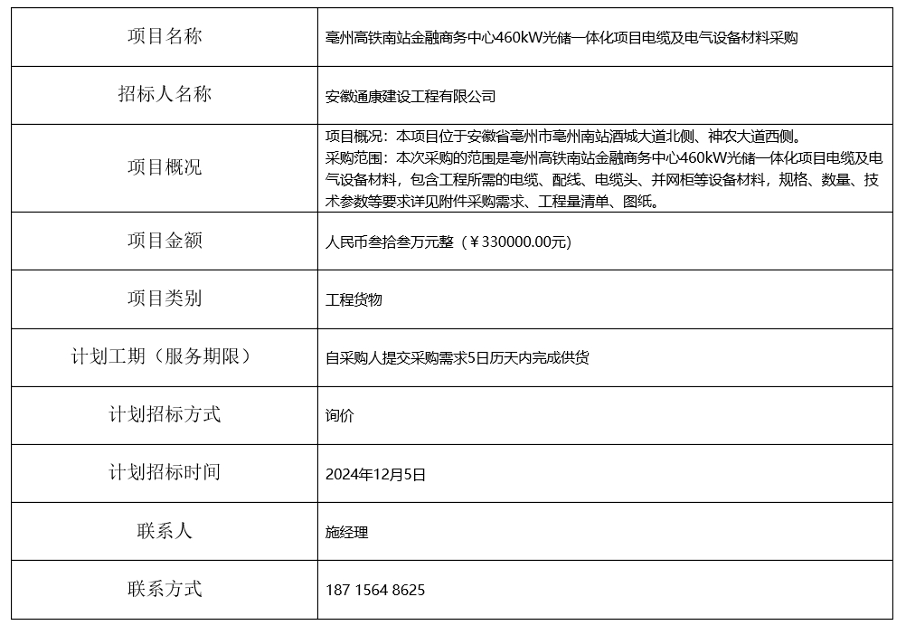 亳州高鐵南站金融商務(wù)中心460kW光儲(chǔ)一體化項(xiàng)目電纜及電氣設(shè)備材料采購(gòu)招標(biāo)計(jì)劃