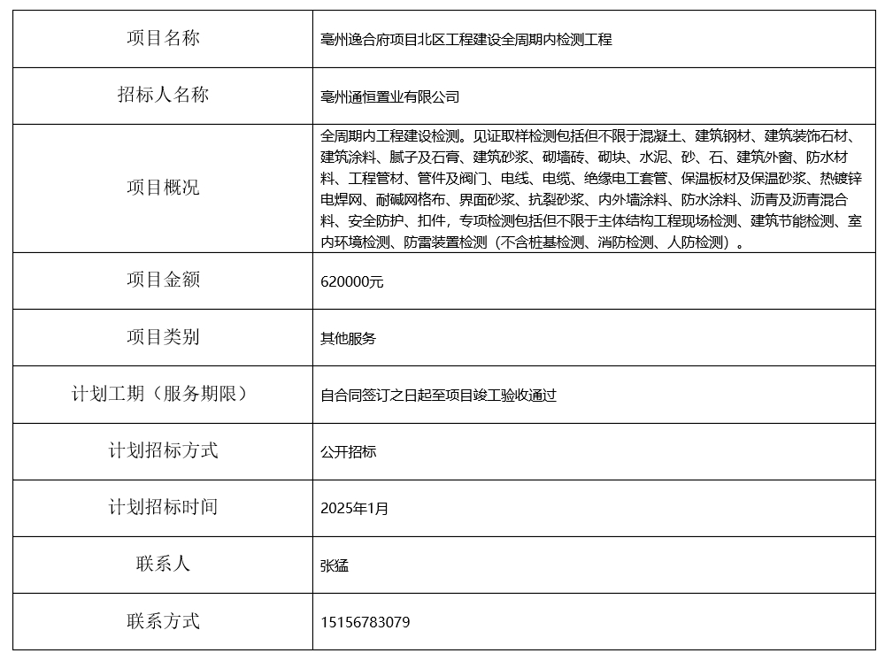 亳州逸合府項(xiàng)目北區(qū)工程建設(shè)全周期內(nèi)檢測工程招標(biāo)計(jì)劃