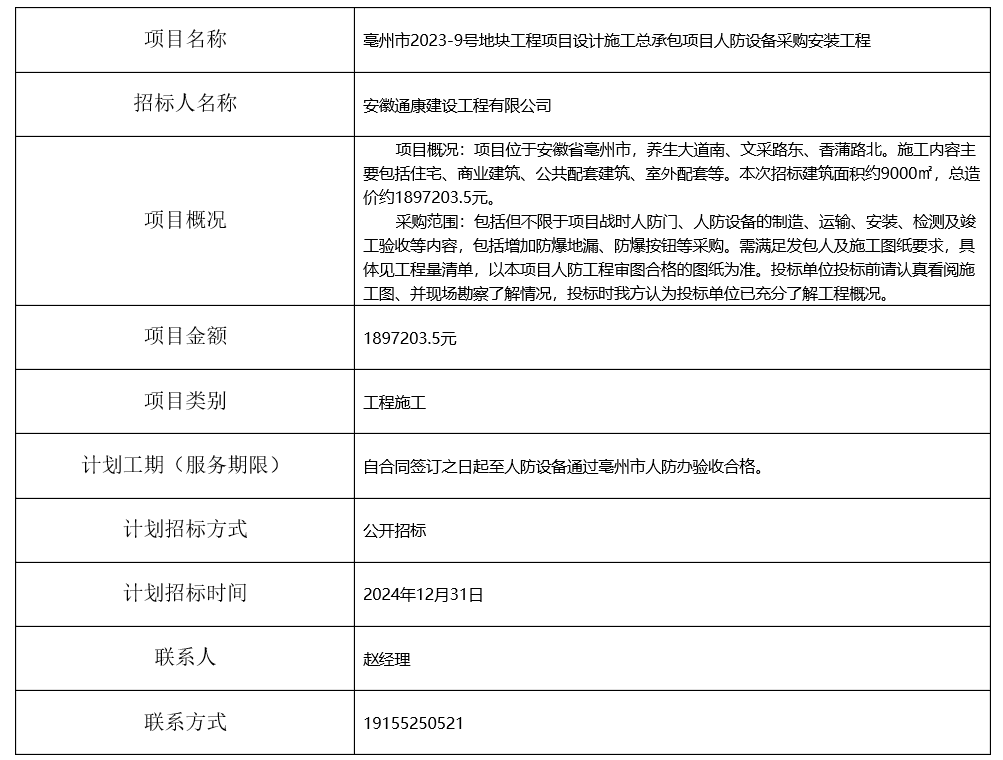 亳州市2023-9號地塊工程項目設計施工總承包項目人防設備采購安裝工程招標計劃