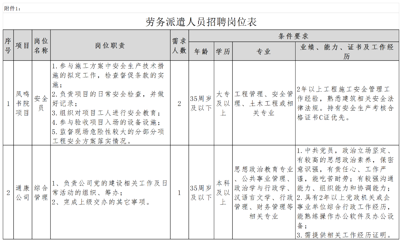 安徽通康建設(shè)工程有限公司(簡稱通康公司)系亳州交通投資控股集團(tuán)有限公司下屬全資子公司,因工作需要,現(xiàn)面向社會公開招聘3名勞務(wù)派遣人員,勞務(wù)派遣人員用工期隨項目工期確定,項目結(jié)束后,勞務(wù)派遣人員及時解散?,F(xiàn)將有關(guān)事項公告如下: