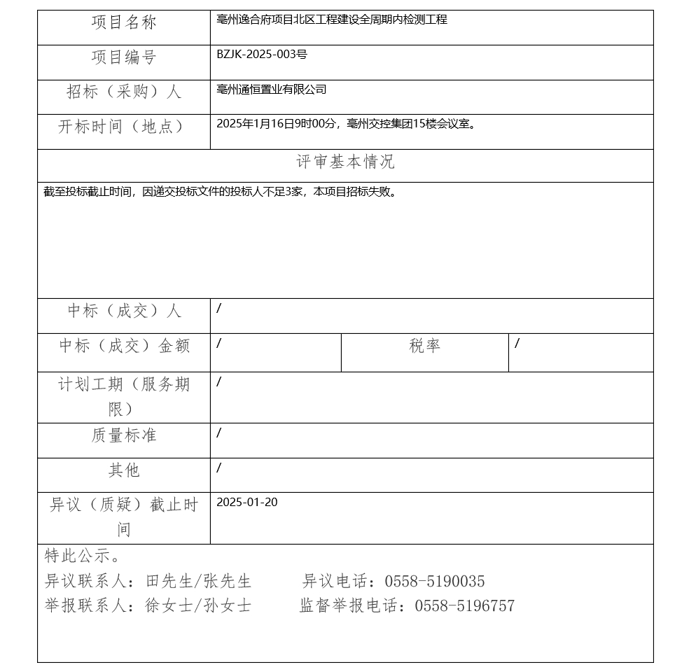 亳州逸合府項目北區(qū)工程建設全周期內(nèi)檢測工程中標(成交)結果公示
