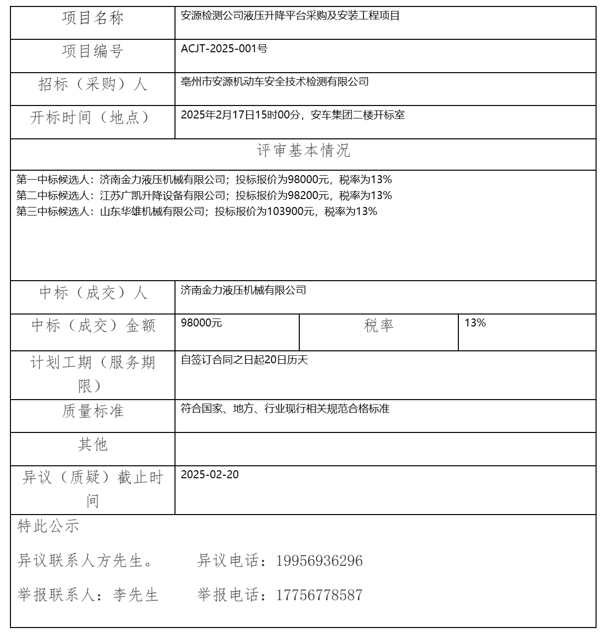 安源檢測公司液壓升降平臺(tái)采購及安裝工程項(xiàng)目中標(biāo)(成交)結(jié)果公示