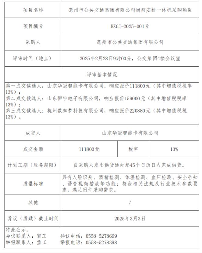 亳州市公共交通集團(tuán)有限公司崗前安檢一體機(jī)采購項(xiàng)目成交結(jié)果公示