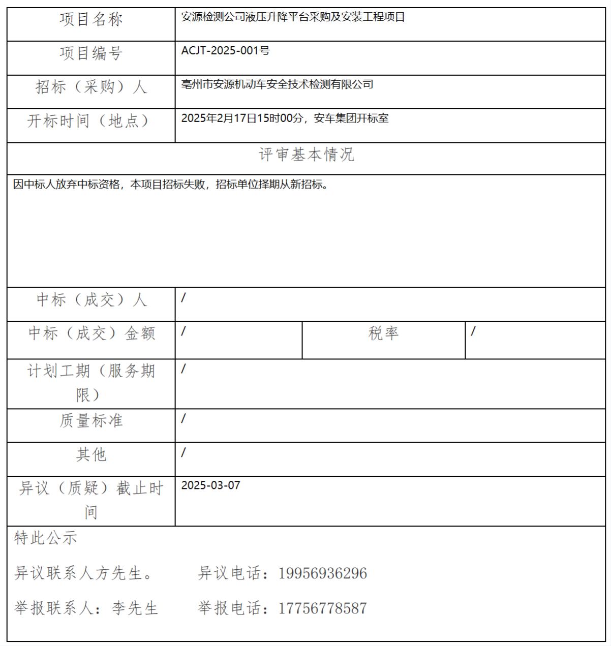 安源檢測公司液壓升降平臺采購及安裝工程項(xiàng)目中標(biāo)(成交)結(jié)果公示