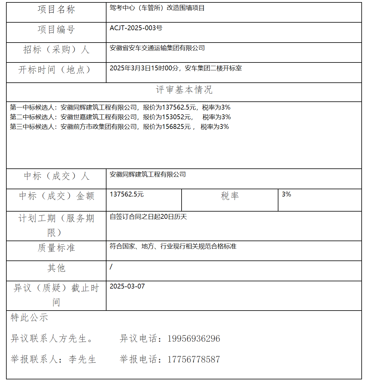 駕考中心(車(chē)管所)改造圍墻項(xiàng)目中標(biāo)(成交)結(jié)果公示