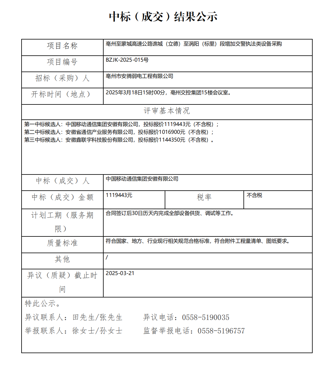 亳州至蒙城高速公路譙城(立德)至渦陽(標(biāo)里)段增加交警執(zhí)法類設(shè)備采購中標(biāo)(成交)結(jié)果公示