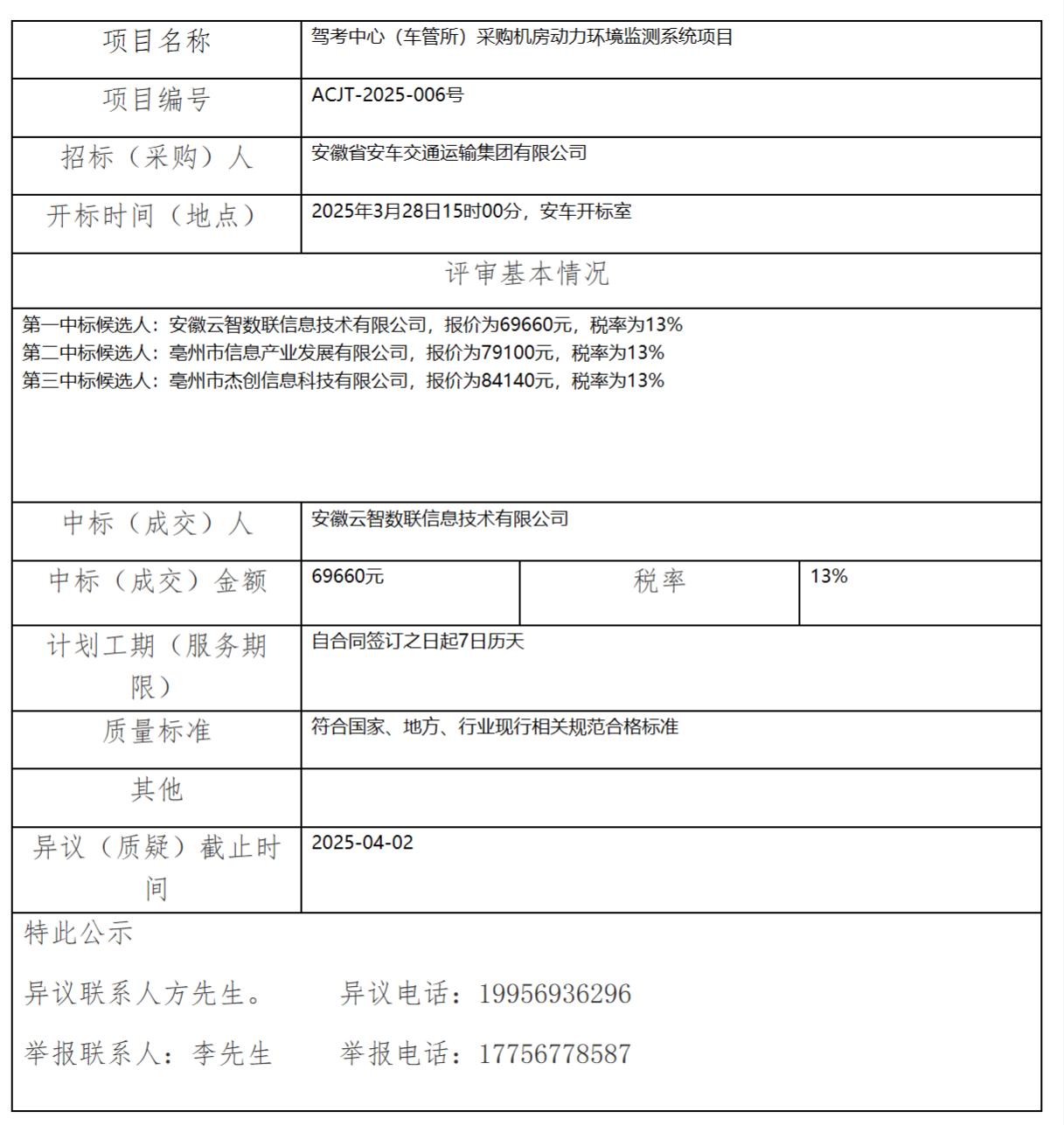 駕考中心(車管所)采購機(jī)房動(dòng)力環(huán)境監(jiān)測系統(tǒng)項(xiàng)目中標(biāo)(成交)結(jié)果公示