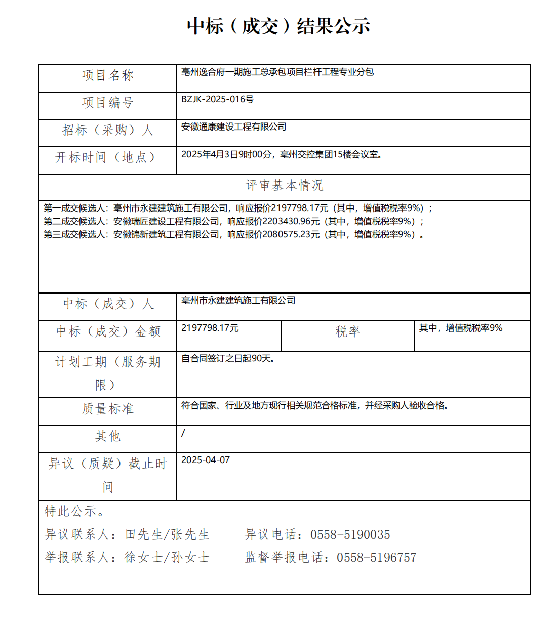 亳州逸合府一期施工總承包項(xiàng)目欄桿工程專(zhuān)業(yè)分包中標(biāo)(成交)結(jié)果公示