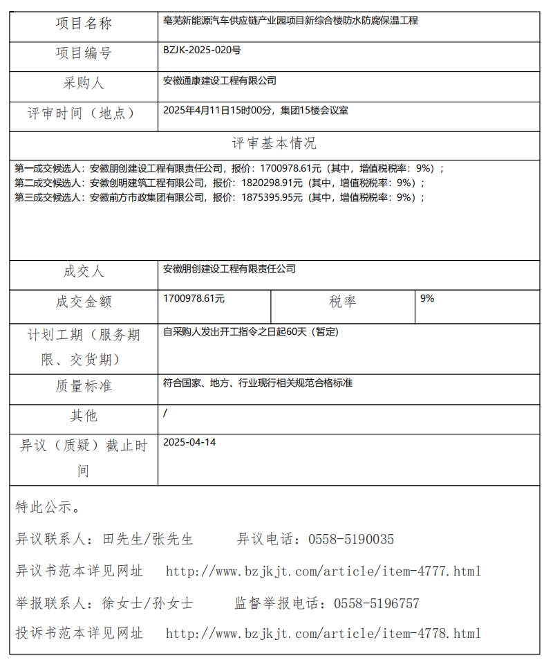 亳蕪新能源汽車供應(yīng)鏈產(chǎn)業(yè)園項目新綜合樓防水防腐保溫工程成交結(jié)果公示