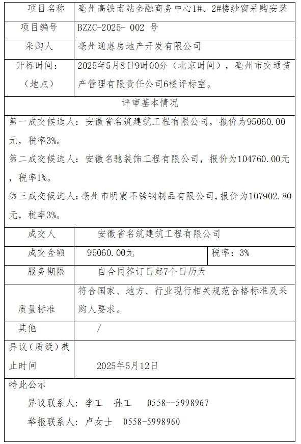 亳州高鐵南站金融商務(wù)中心1#、2#樓紗窗采購(gòu)安裝成交結(jié)果公示