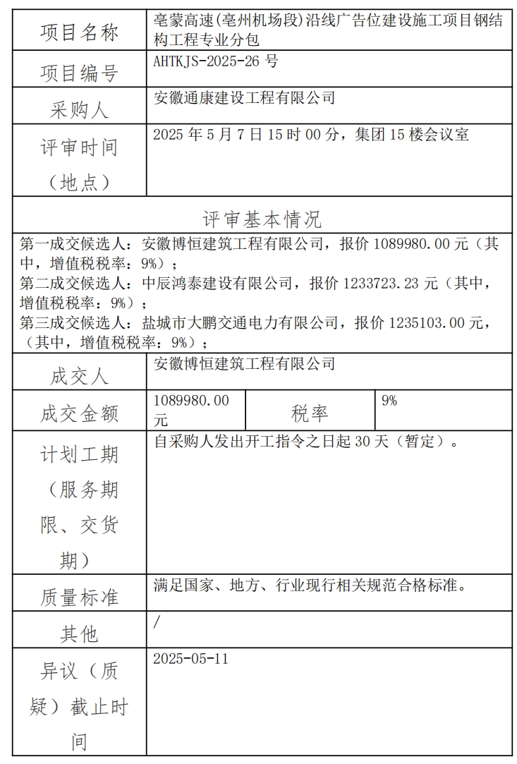 亳蒙高速(亳州機場段)沿線廣告位建設施工項目鋼結構工程專業(yè)分包成交結果公示