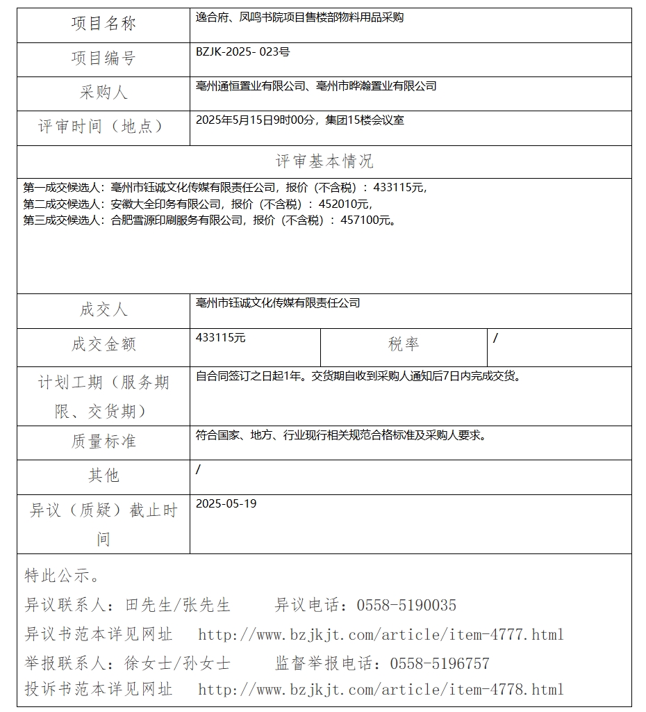 逸合府、鳳鳴書院項目售樓部物料用品采購成交結果公示