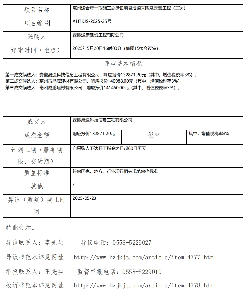 亳州逸合府一期施工總承包項(xiàng)目煙道采購及安裝工程(二次)成交結(jié)果公示