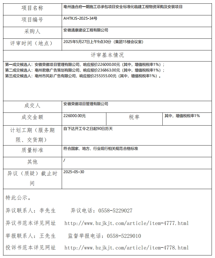 亳州逸合府一期施工總承包項目安全標準化臨建工程物資采購及安裝項目成交結(jié)果公示
